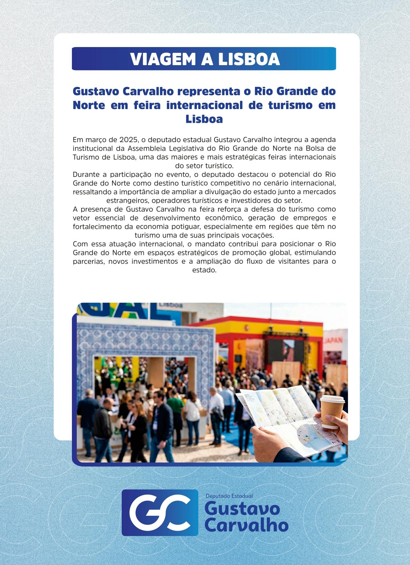 O mês de março de 2025 marcou mais um importante capítulo na atuação do deputado estadual Gustavo Carvalho em defesa do Rio Grande do Norte. Representando oficialmente a Assembleia Legislativa, o parlamentar integrou a agenda institucional na Bolsa de Turismo de Lisboa, uma das maiores e mais relevantes feiras internacionais do setor, levando o nome do estado aos principais mercados globais de turismo.